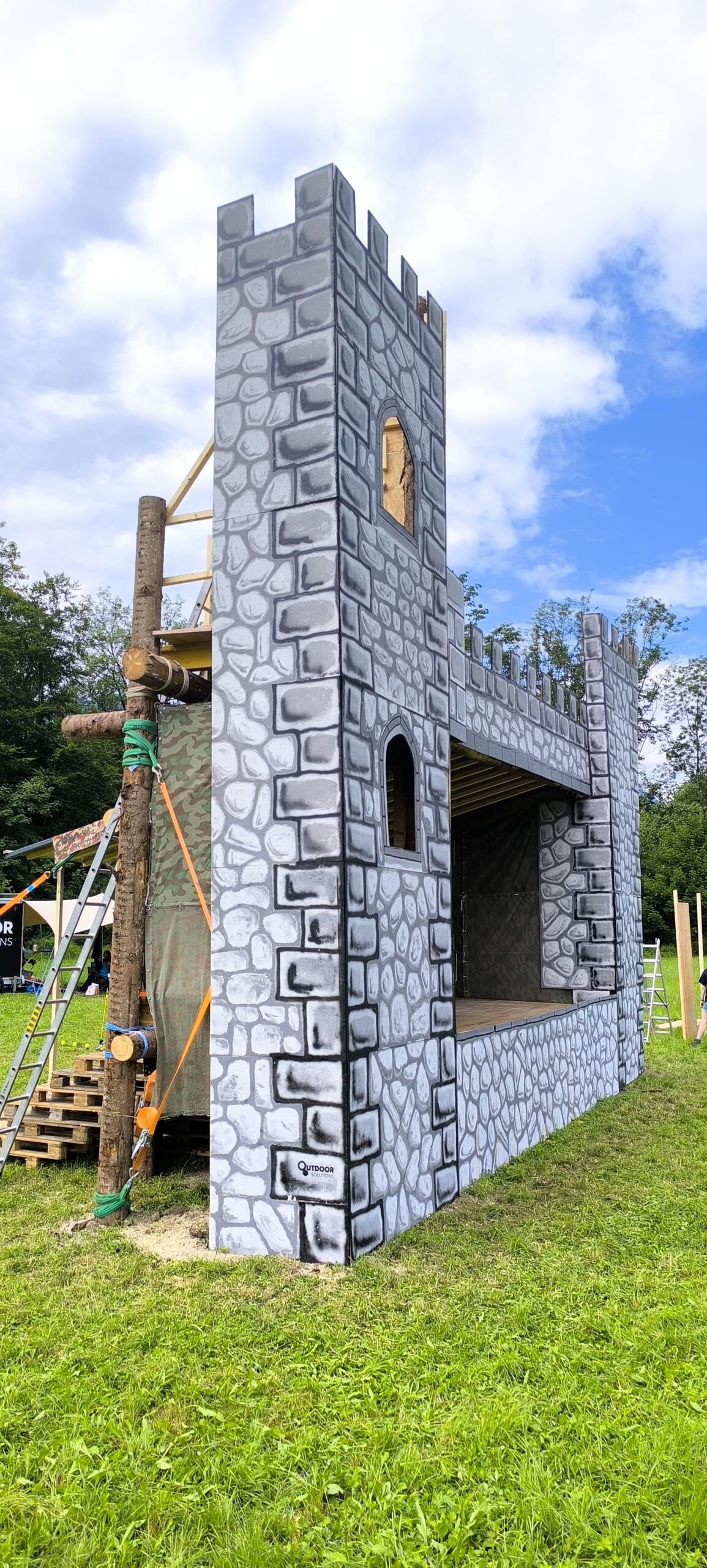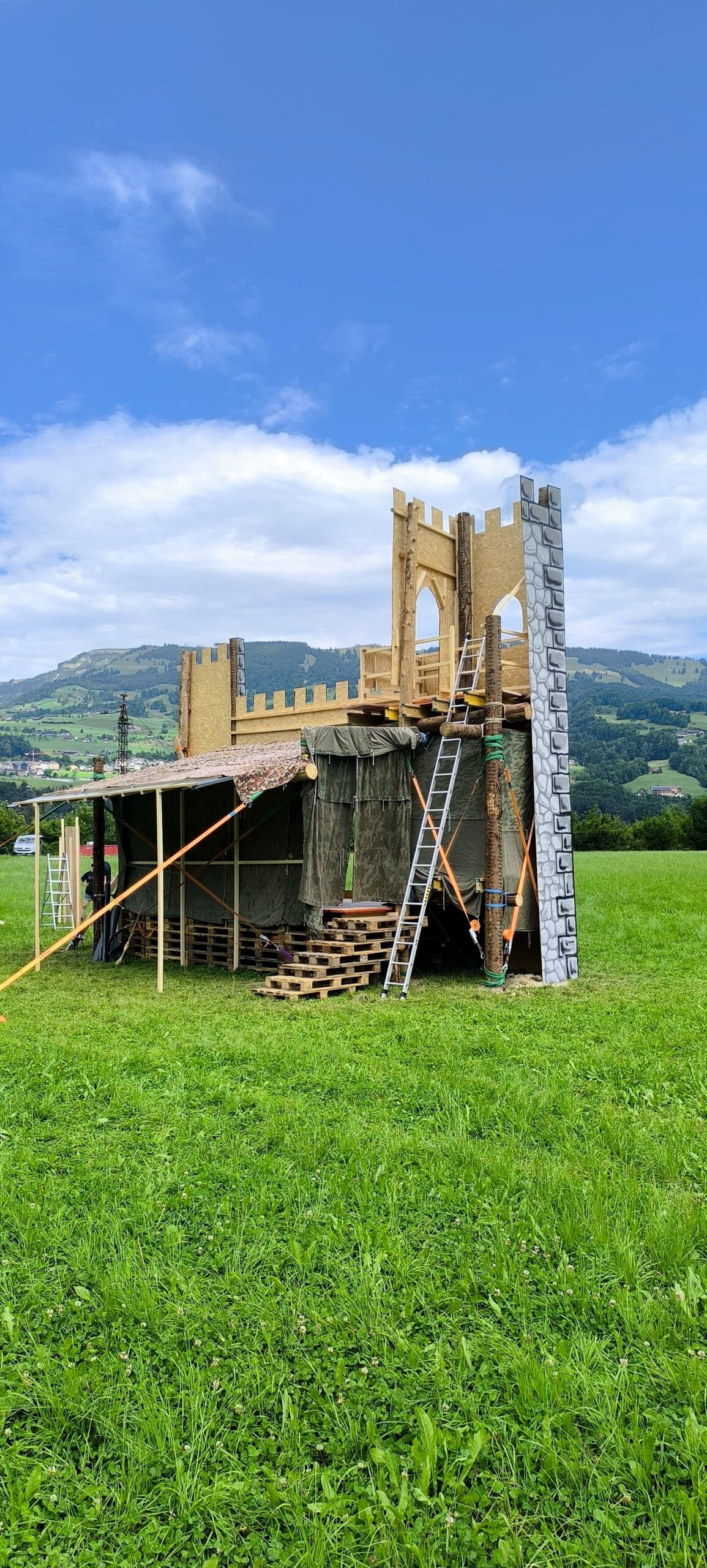 Im Holzbauten mit Stoff zu bespannen sind wir mittlerweile geübte Profis, doch diesmal entschieden wir uns für Holz als Fassade. Nicht zuletzt, weil wir aus Rundhölzern einen Turm bauten, der am Schluss eckig wie eine Steinmauer sein sollte. OSB-Platten und Universalgewebe haben einen vergleichbaren Preis. Platten kann man hingegen am Boden vorbereiten, bemalen und am Ende nur montieren. Es war für uns das erste Mal, dass wir mit OSB-Platten arbeiteten, und alle waren etwas nervös: Werden sie brechen? Aufquellen bei Regen? Dem Wind standhalten? Wie montiert man eine solche Platte auf über 6 Meter Höhe? Alles kein Problem. Auch das wasserziehende Verhalten dieser Platten spielt bei zwei Wochen keine grosse Rolle. Nach zweieinhalb Tagen war für uns das Märli vorbei, und wir durften eine wunderschöne Burg ans Ürner Kala übergeben.