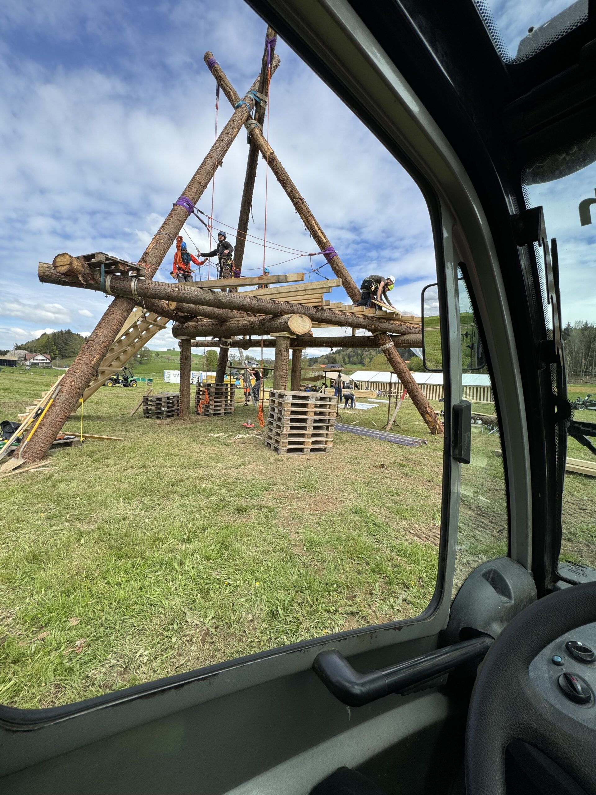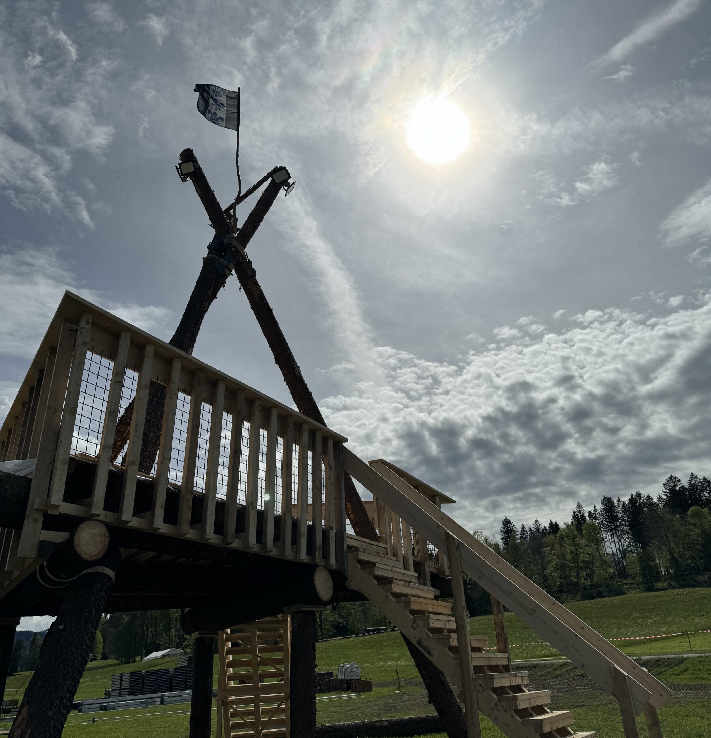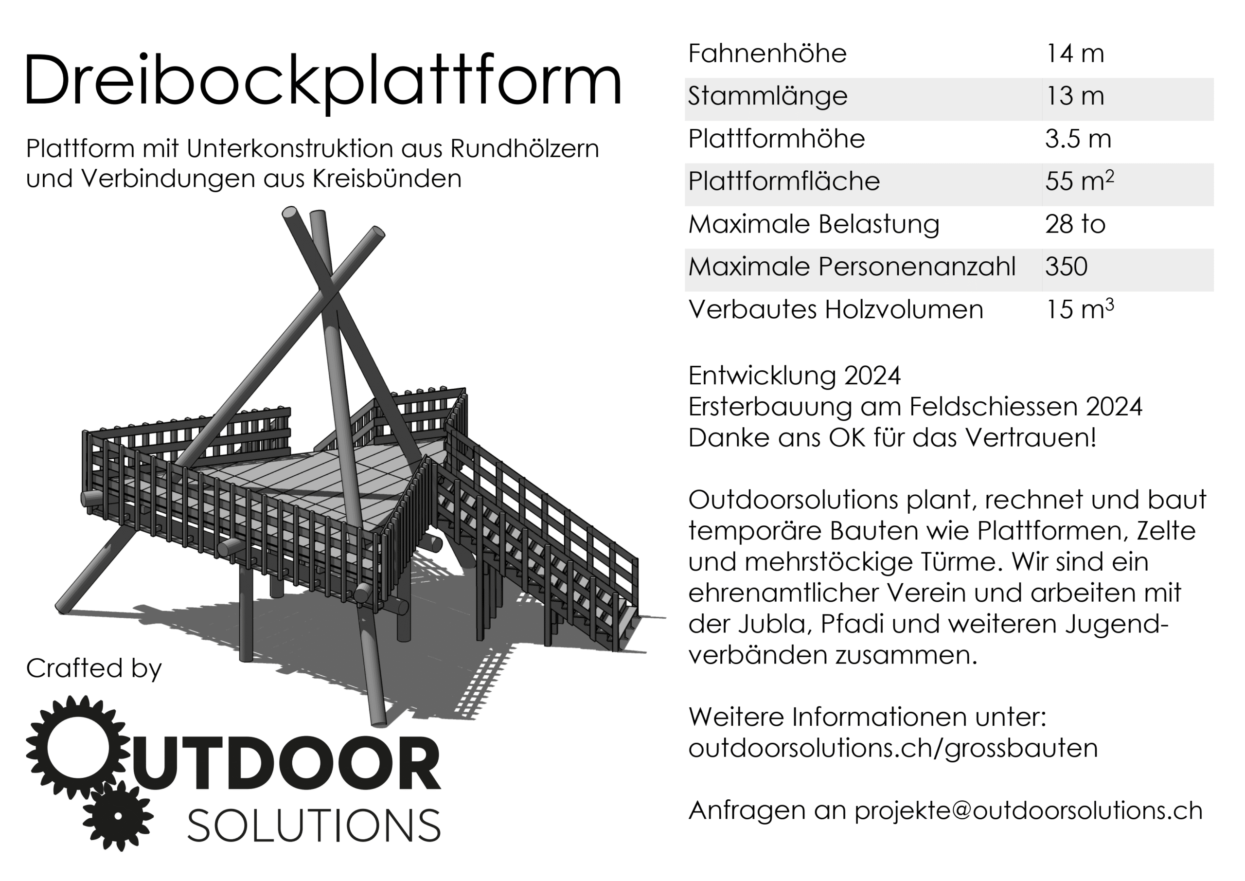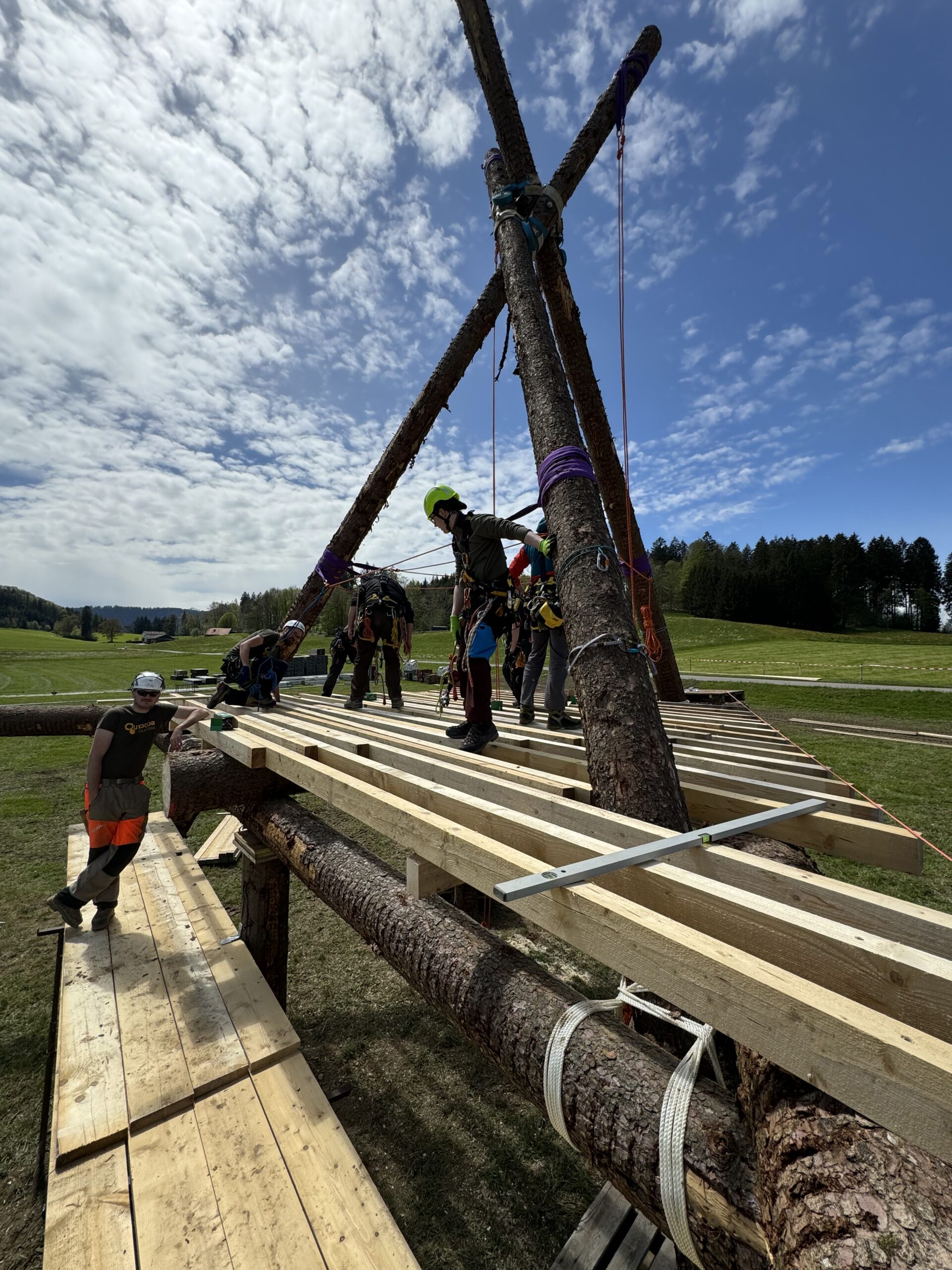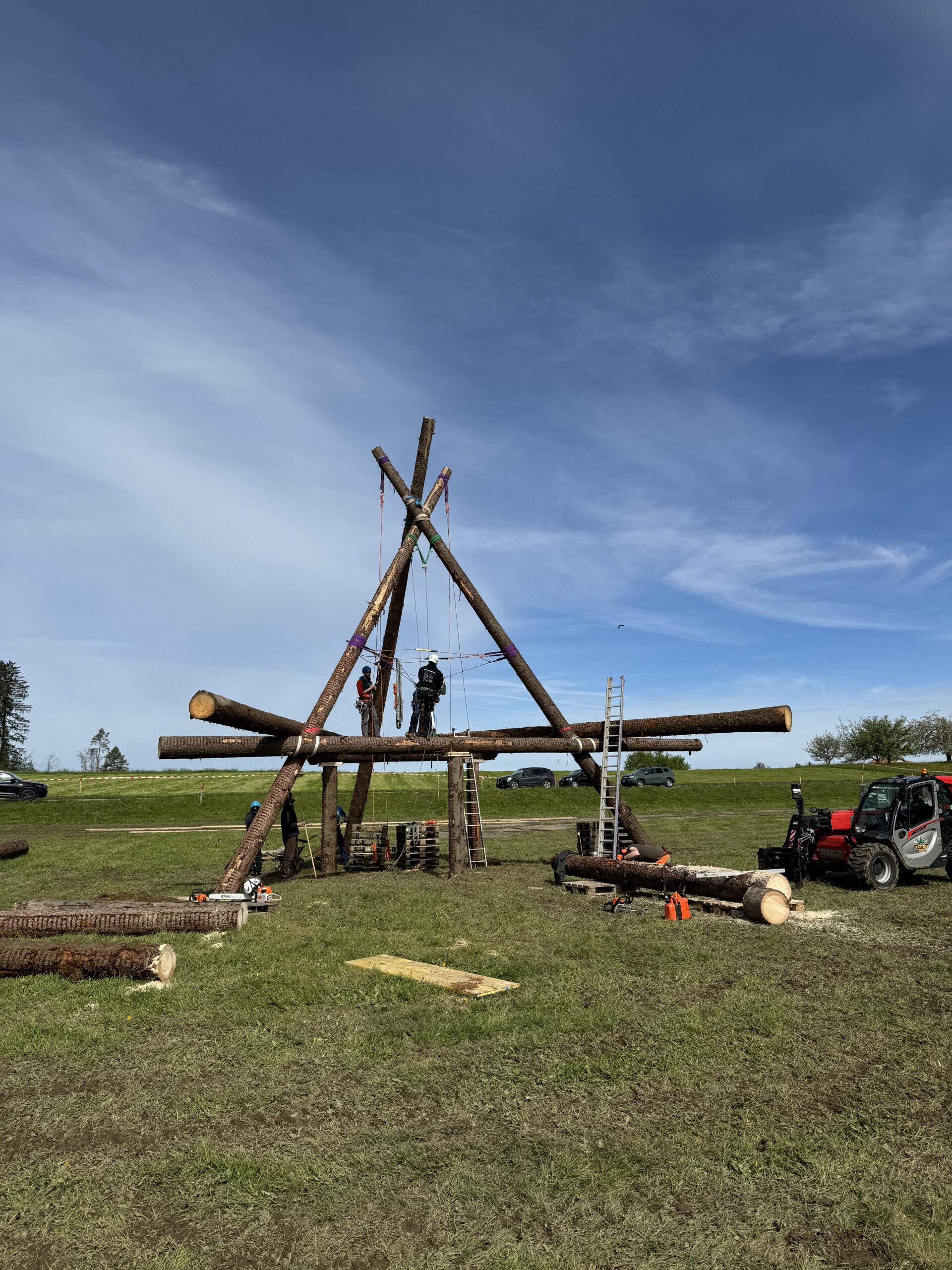 Das Feldschiessen Sense 2024 fand in Rechthalten FR statt und war für einige Kernmitglieder Heimspiel – entsprechend gross war die Begeisterung, lokal tätig zu sein. Vom OK gewünscht war ein Dreibock mit einer Plattform – und genau das planten wir und setzen es um. Der Bau sollte möglichst rustikal daherkommen, und daher war für uns klar, dass die Haupttragelemente aus Rundholz sein mussten.