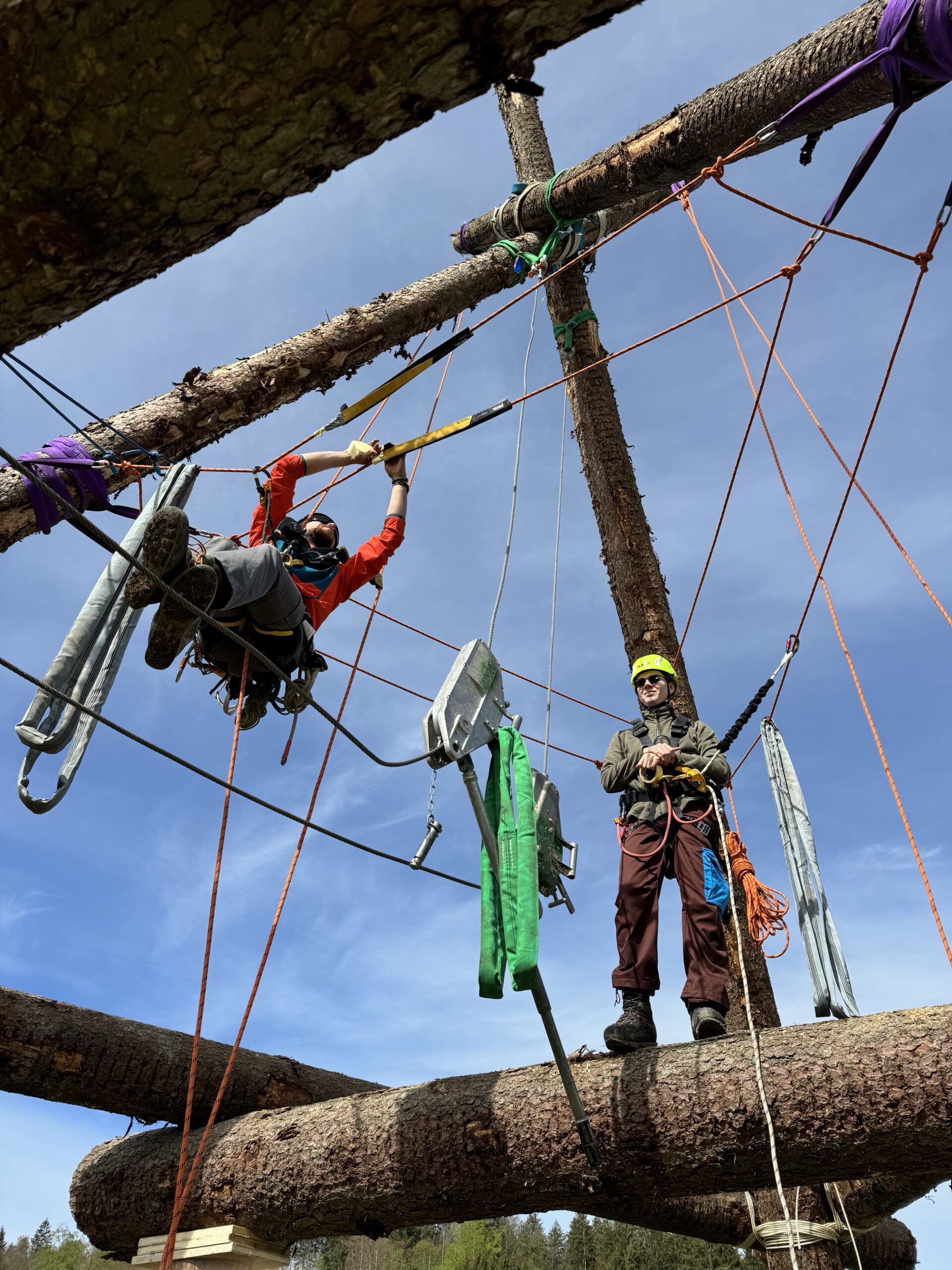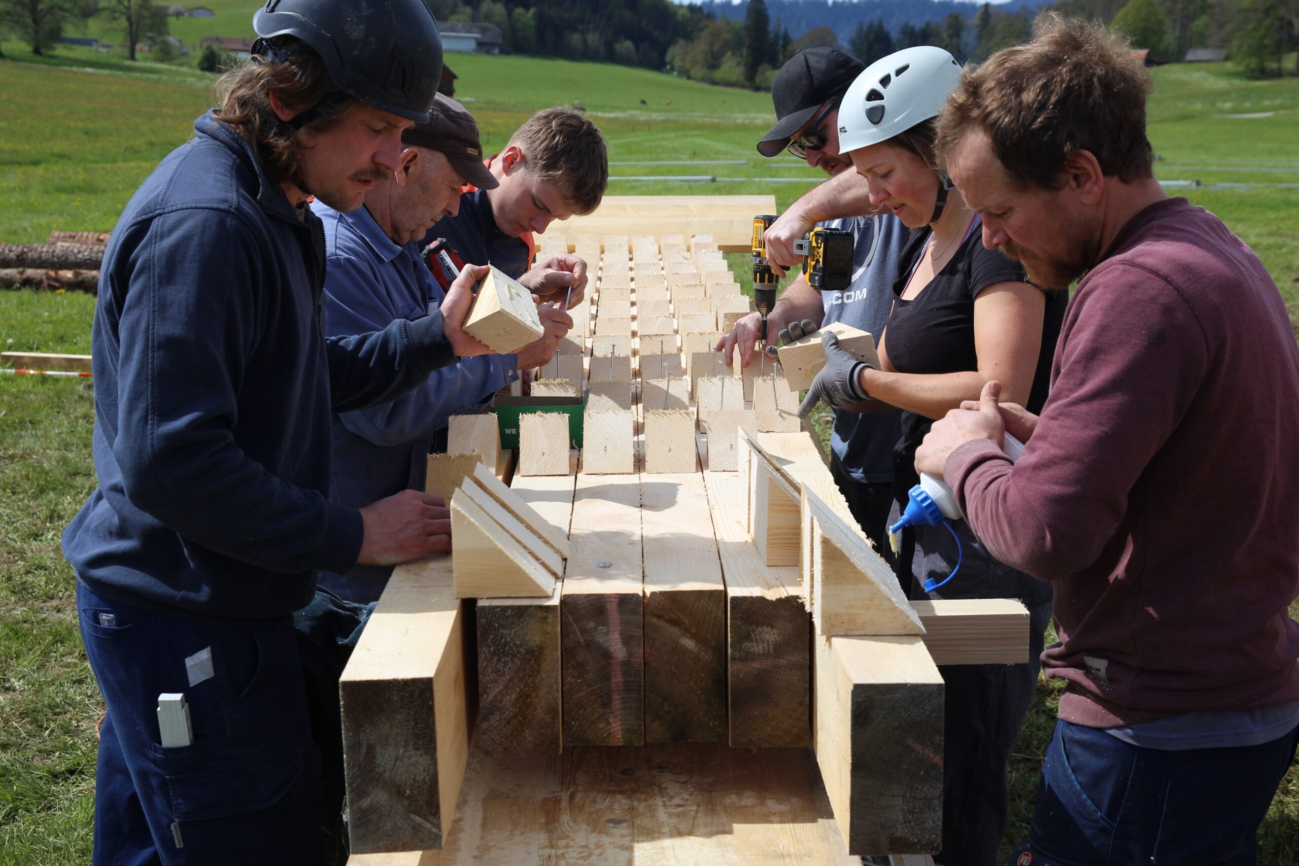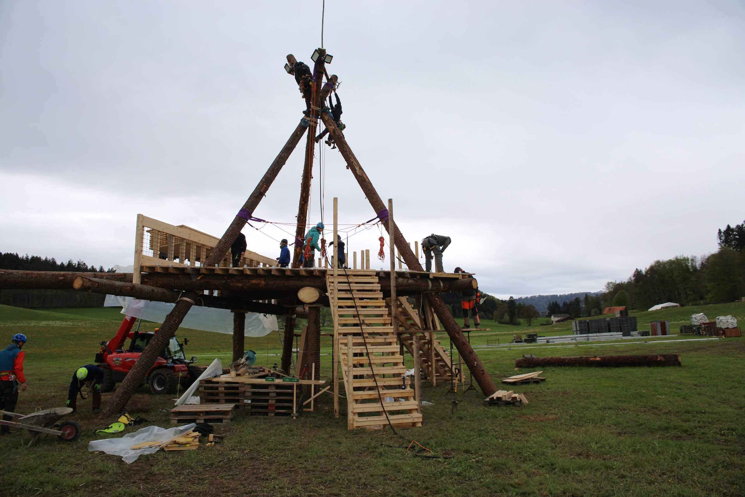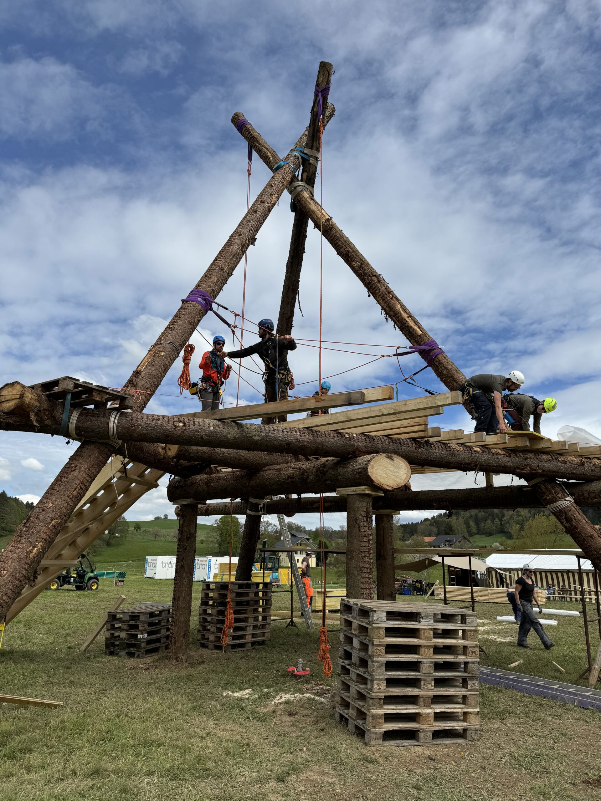 Der Dreibock benötigte insgesamt 15m3 Holz und entsprechend war es uns und dem Veranstalter ein grosses Anliegen, möglichst wiederverwendbare Materialien einzusetzen aus Nachhaltigskeits- und Resourcengründen. Sämtliches Holz der Haupttragelemente war Rundholz und konnte danach weiterverarbeitet werden, sämtliches Holz der sekundären Balkenlage waren Maurerkanthölzer und konnten anschliessend wieder auf dem Bau verwendet werden, ebenso die Bodenbretter der Plattform (Schalungstafeln), und für die Geländerzäune verwendeten wir Armierungsgitter, welche nebenbei perfekt zum dunklen Erscheinungsbild des Baus passten und einen tollen Kontrast zu den gesägten Brettern darstellten.