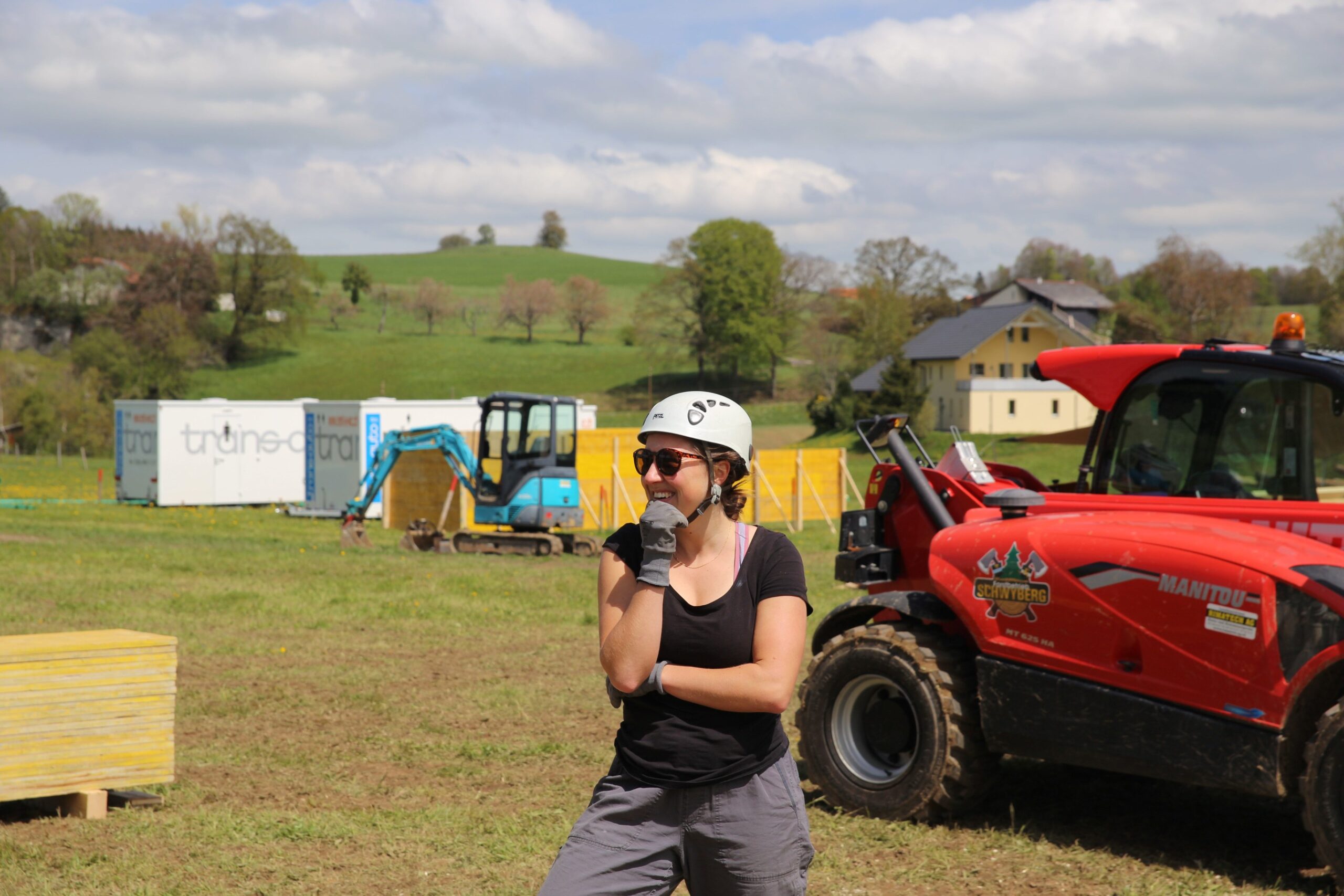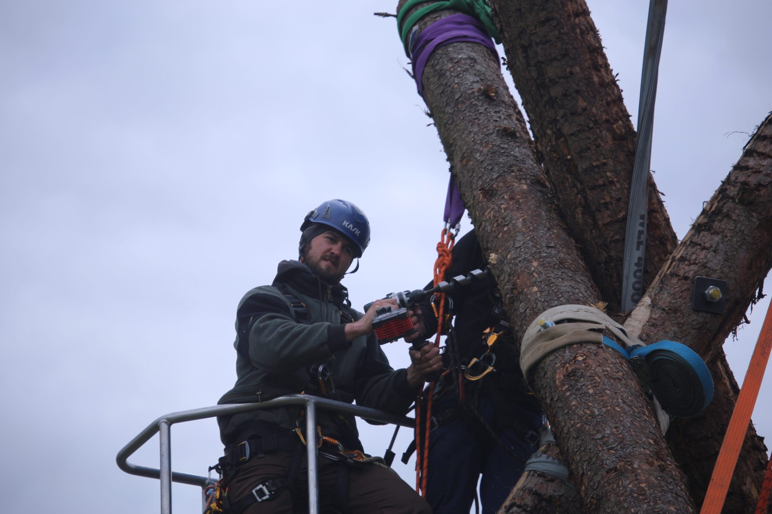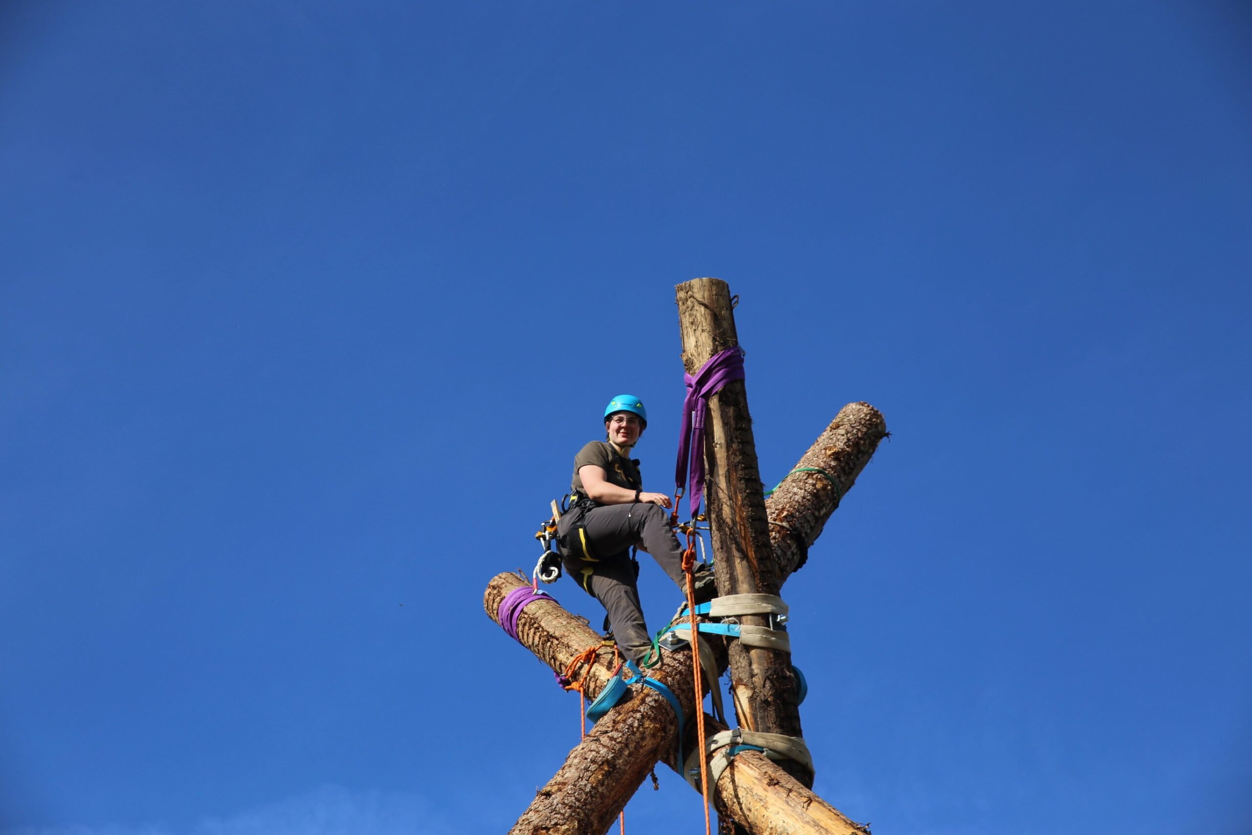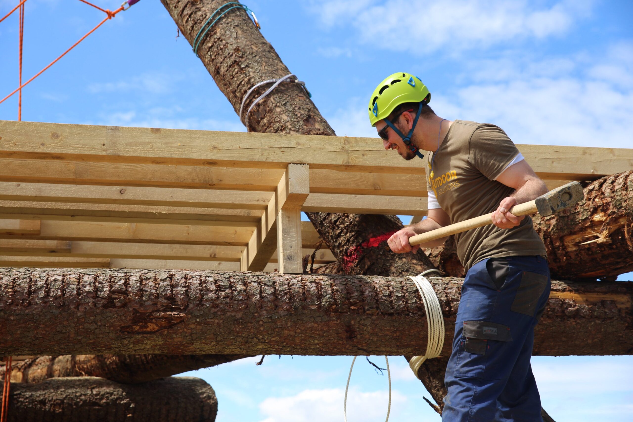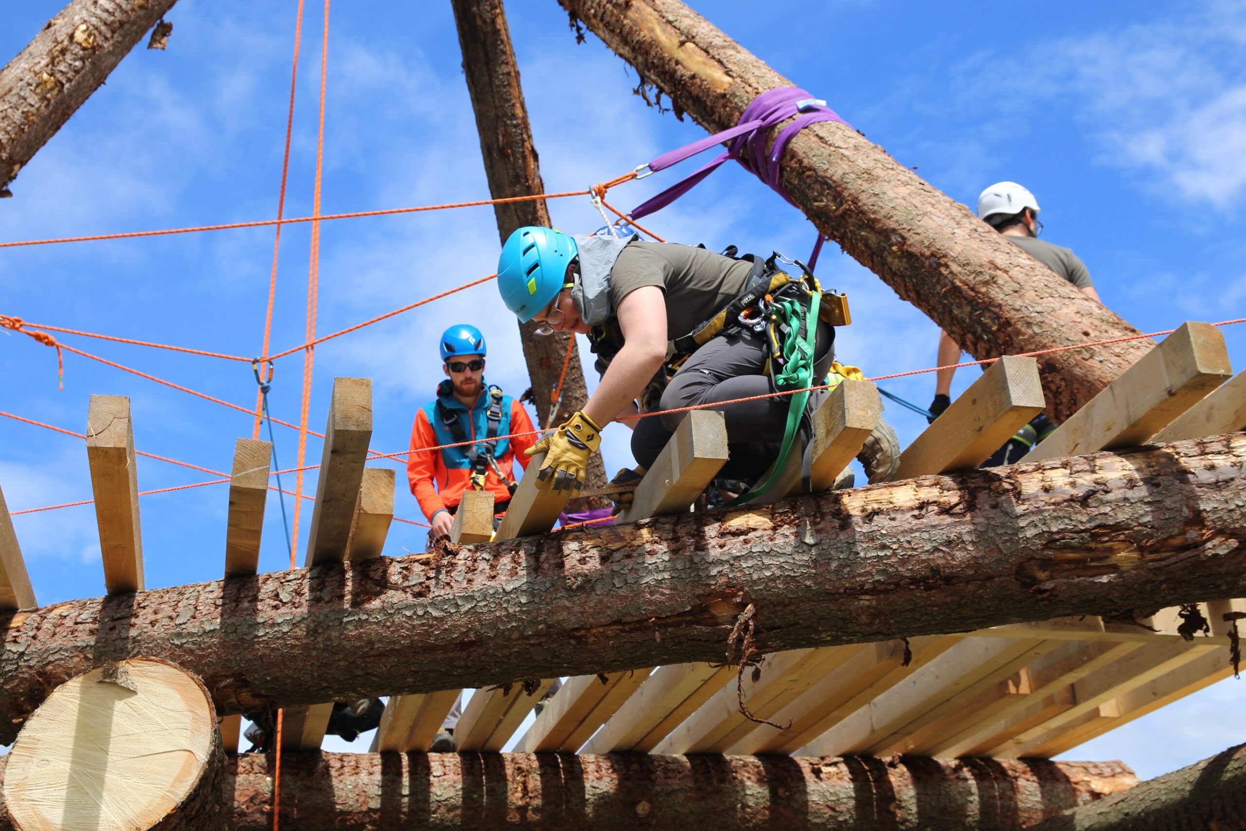 Der Dreibock benötigte insgesamt 15m3 Holz und entsprechend war es uns und dem Veranstalter ein grosses Anliegen, möglichst wiederverwendbare Materialien einzusetzen aus Nachhaltigskeits- und Resourcengründen. Sämtliches Holz der Haupttragelemente war Rundholz und konnte danach weiterverarbeitet werden, sämtliches Holz der sekundären Balkenlage waren Maurerkanthölzer und konnten anschliessend wieder auf dem Bau verwendet werden, ebenso die Bodenbretter der Plattform (Schalungstafeln), und für die Geländerzäune verwendeten wir Armierungsgitter, welche nebenbei perfekt zum dunklen Erscheinungsbild des Baus passten und einen tollen Kontrast zu den gesägten Brettern darstellten.