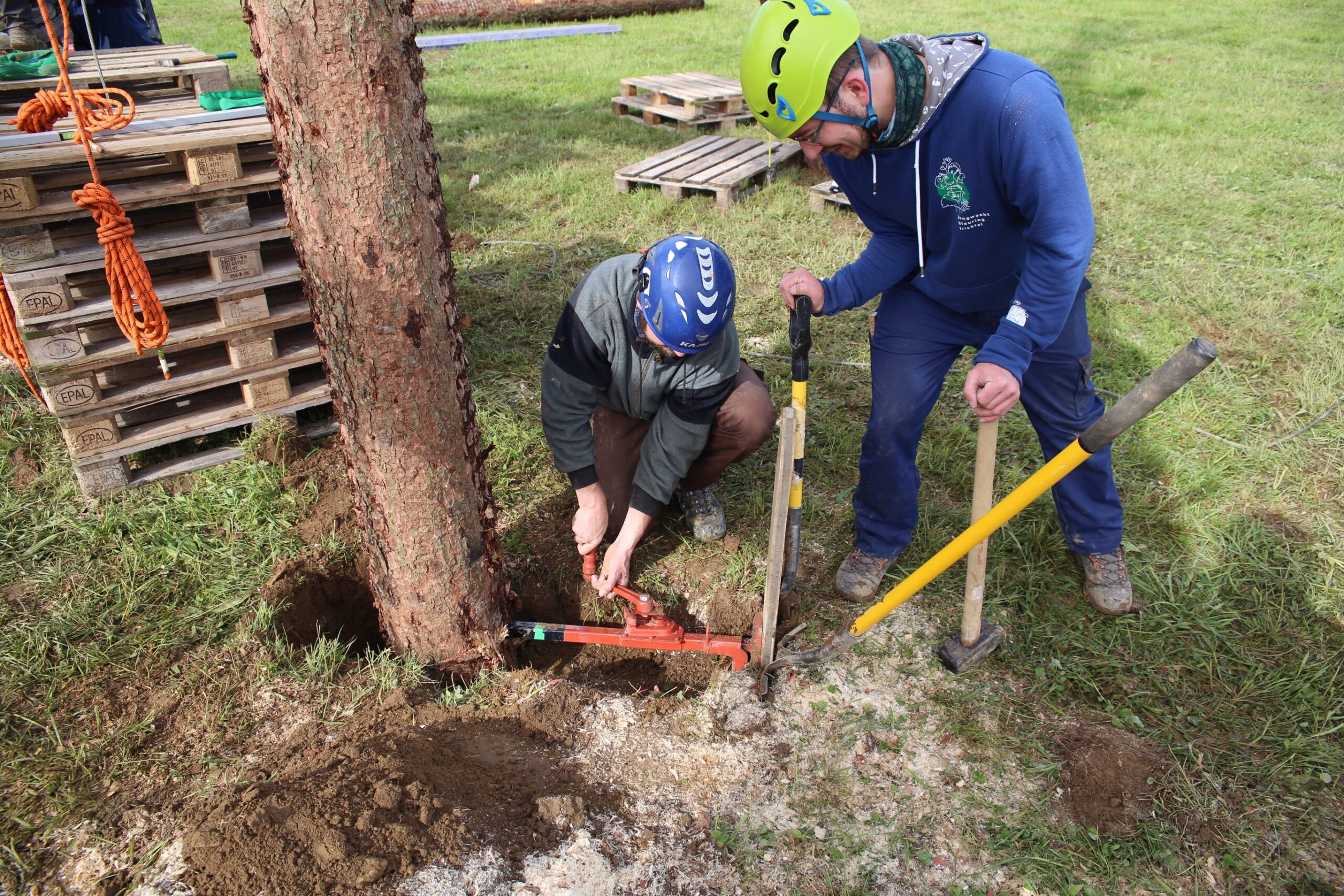 Aus ausgiebigen Tests (siehe Homepage unter Technik) wissen wir, dass bei einem Kreisbund die Belastungsgrenze linear mit der Windungsanzahl steigt. Ein Kreisbund mit 7 Windungen unserer geliebten 6mm-Kreisbundschnur hält somit 8.4to aus einzig mit den oberen Windungen, und wir wissen, dass auch die unteren Teilwindungen anfangen zu tragen, wenn der Kreisbund entsprechend weit nach unten gerutscht ist. Für diesen Anlass war Rutschen aber keine Option, da das einerseits geometrisch aufgrund des Dreibocks gar nicht möglich war, und andererseits die Treppen, die fest im Erdreich waren, natürlich nicht mitrutschen konnten. Entsprechend entschieden wir uns, 10mm-Kreisbundschnur einzusetzen, um auch unter Volllast einen angenehmen Sicherheitsfaktor zu haben.