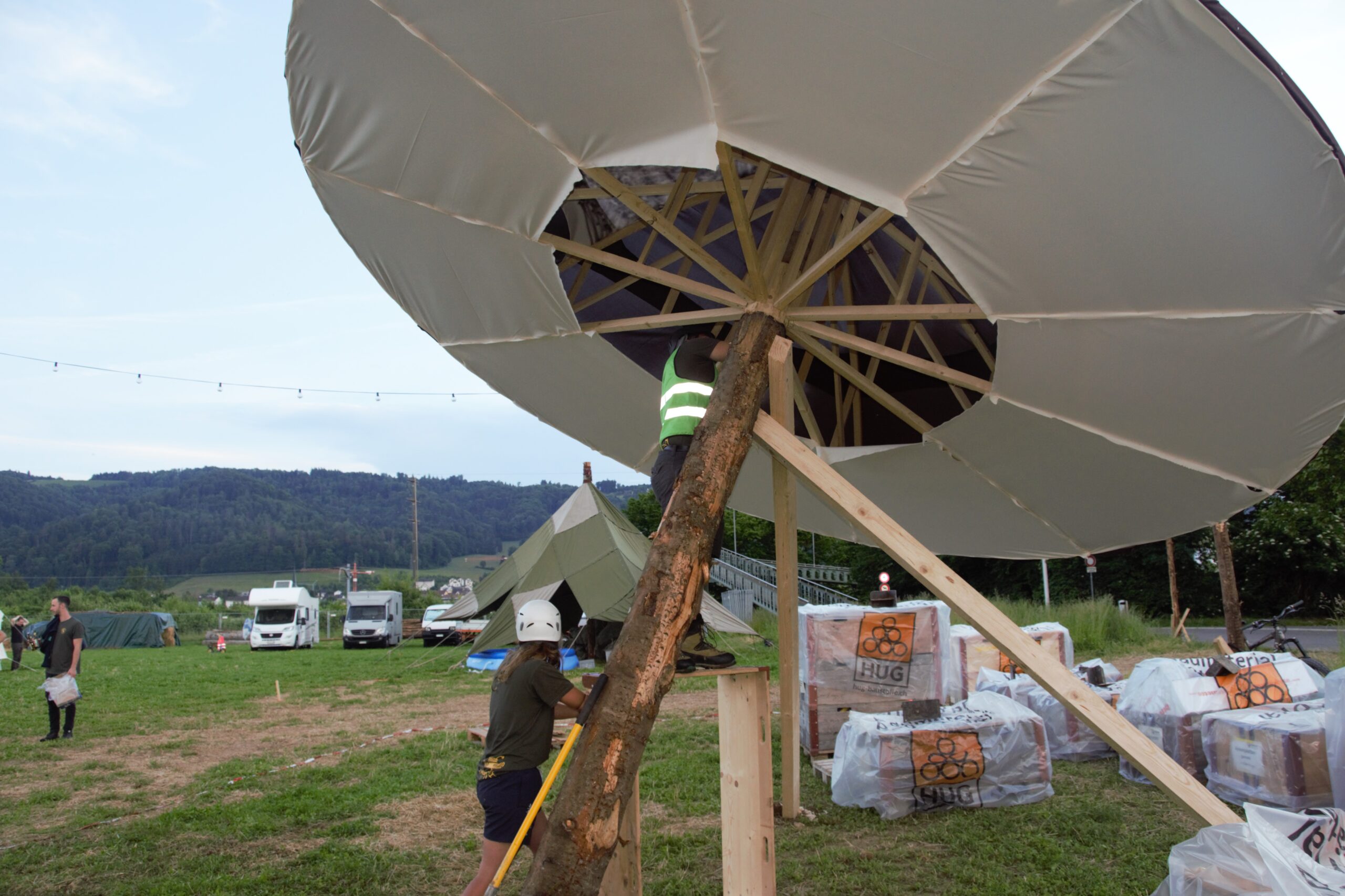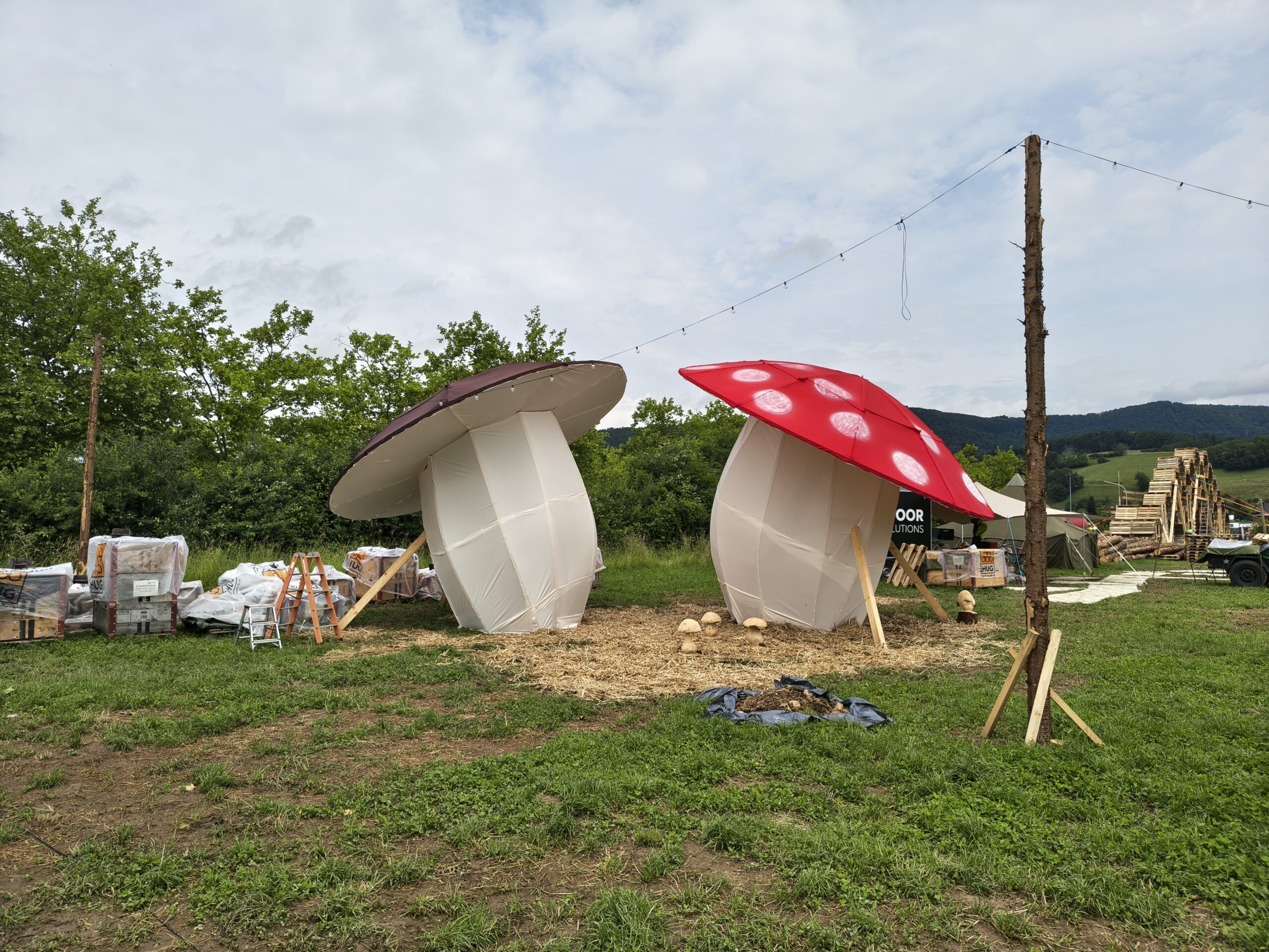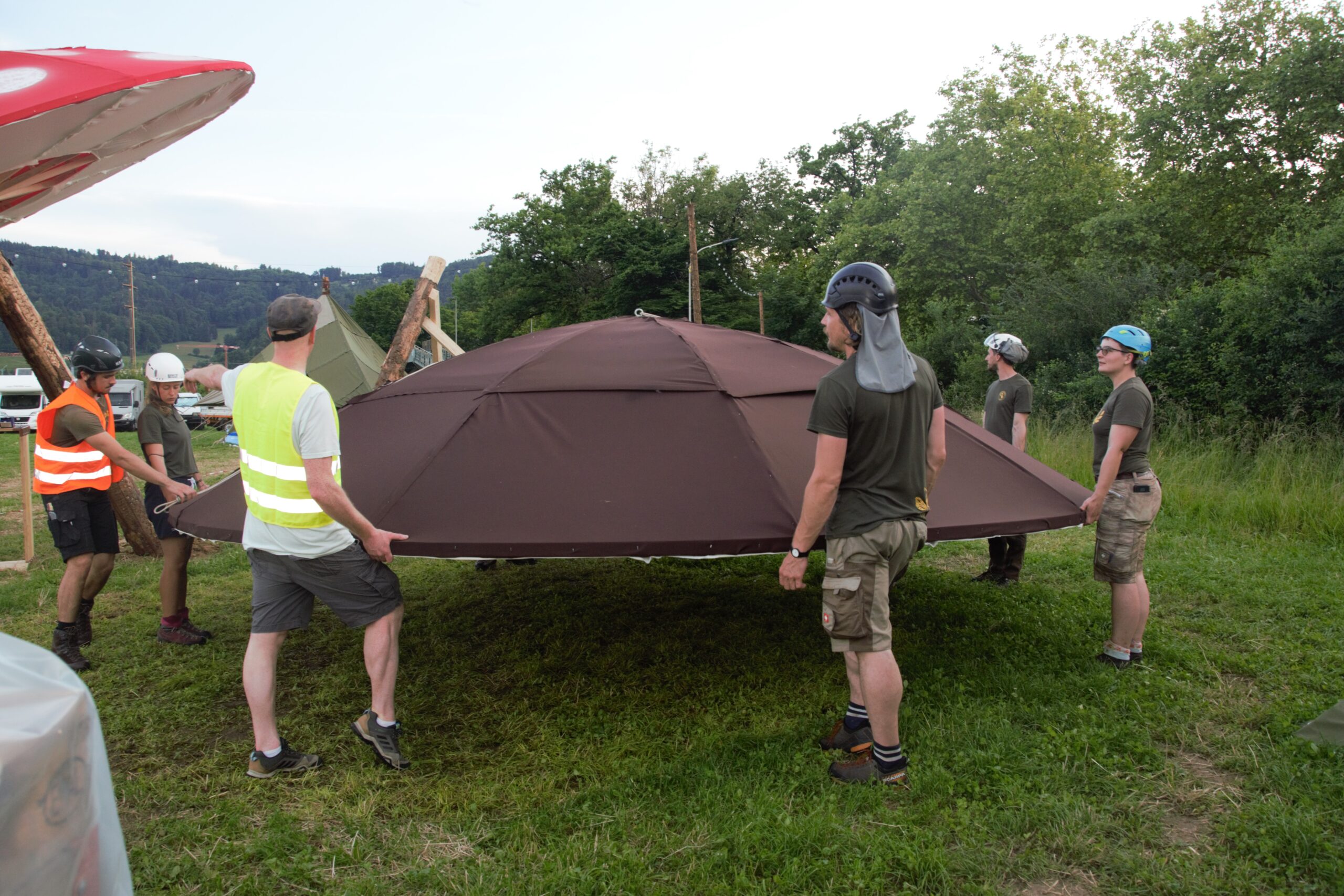 Das nationale Pfingstlager von Jungwacht Blauring, Jublasurium, ludt ein zur Insektenkonferenz. Menschen in Insektengrösse bedeutet Pilze in Übergrösse – entsprechend angetan waren wir von der Idee, zwei Mottopilze zu gestalten. Mit einem kleinen Team und inmitten von 5 weiteren Bauten von Outdoorsolutions machten wir uns ans Anfertigen und Bespannen von Kugelsegmenten.