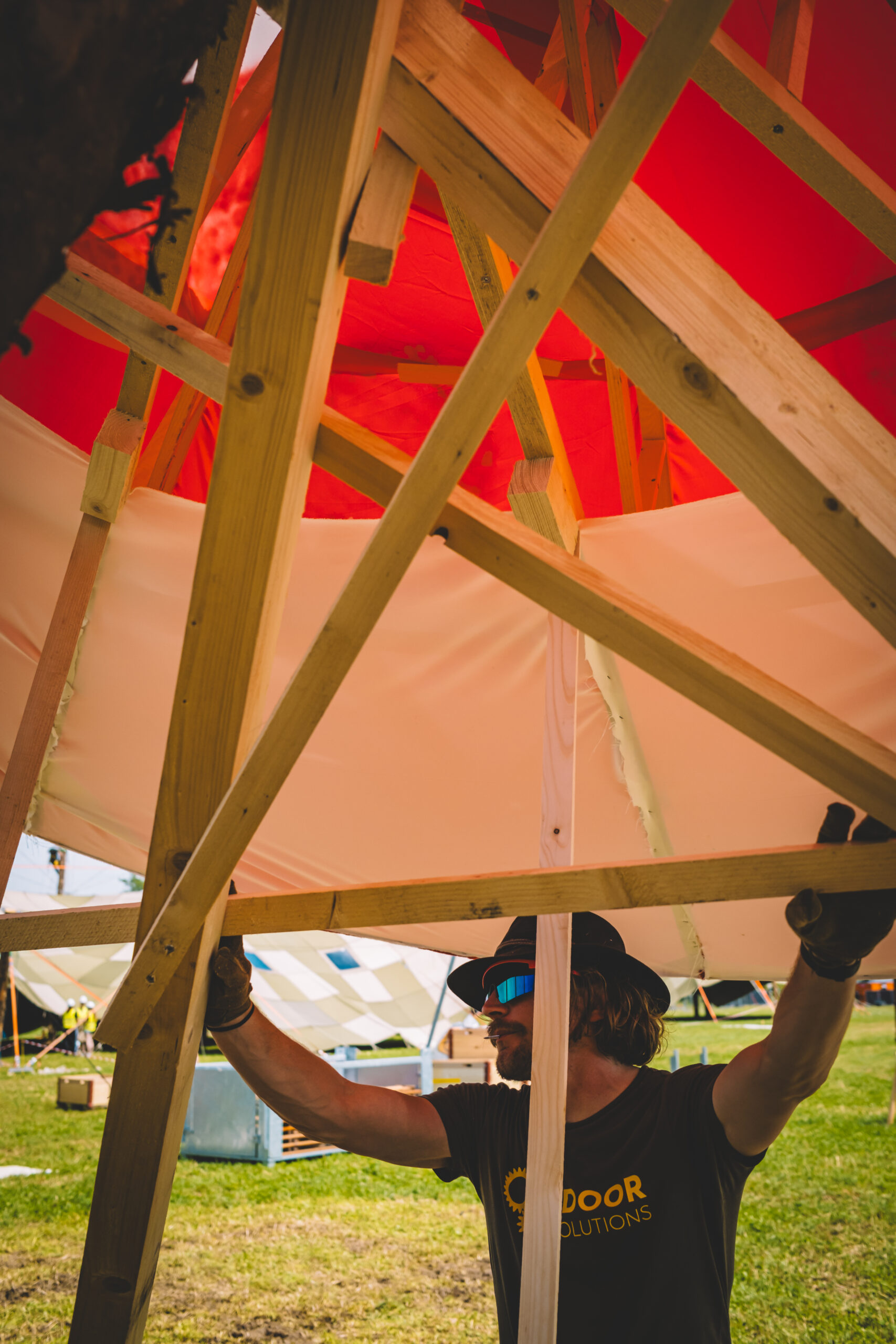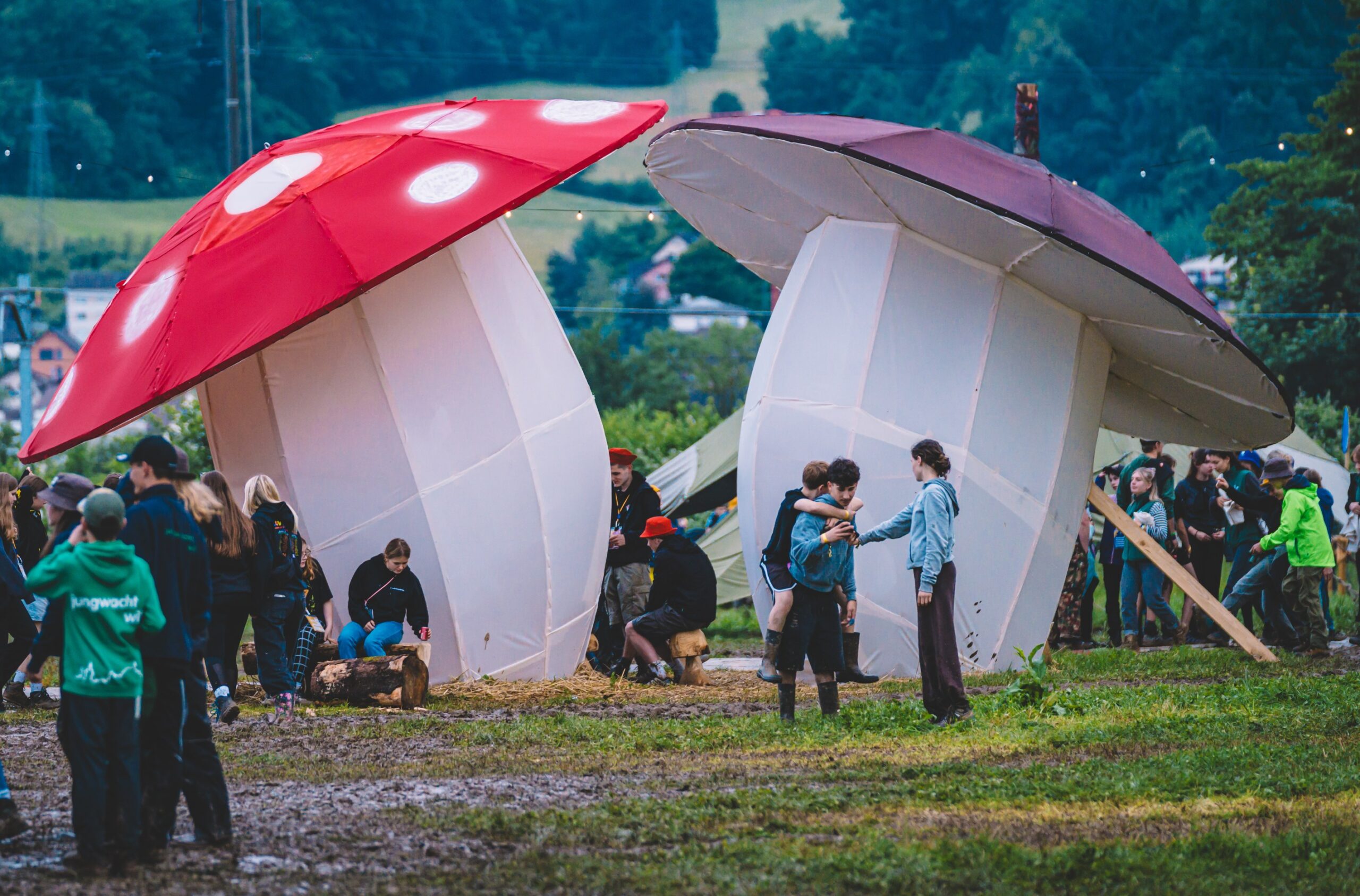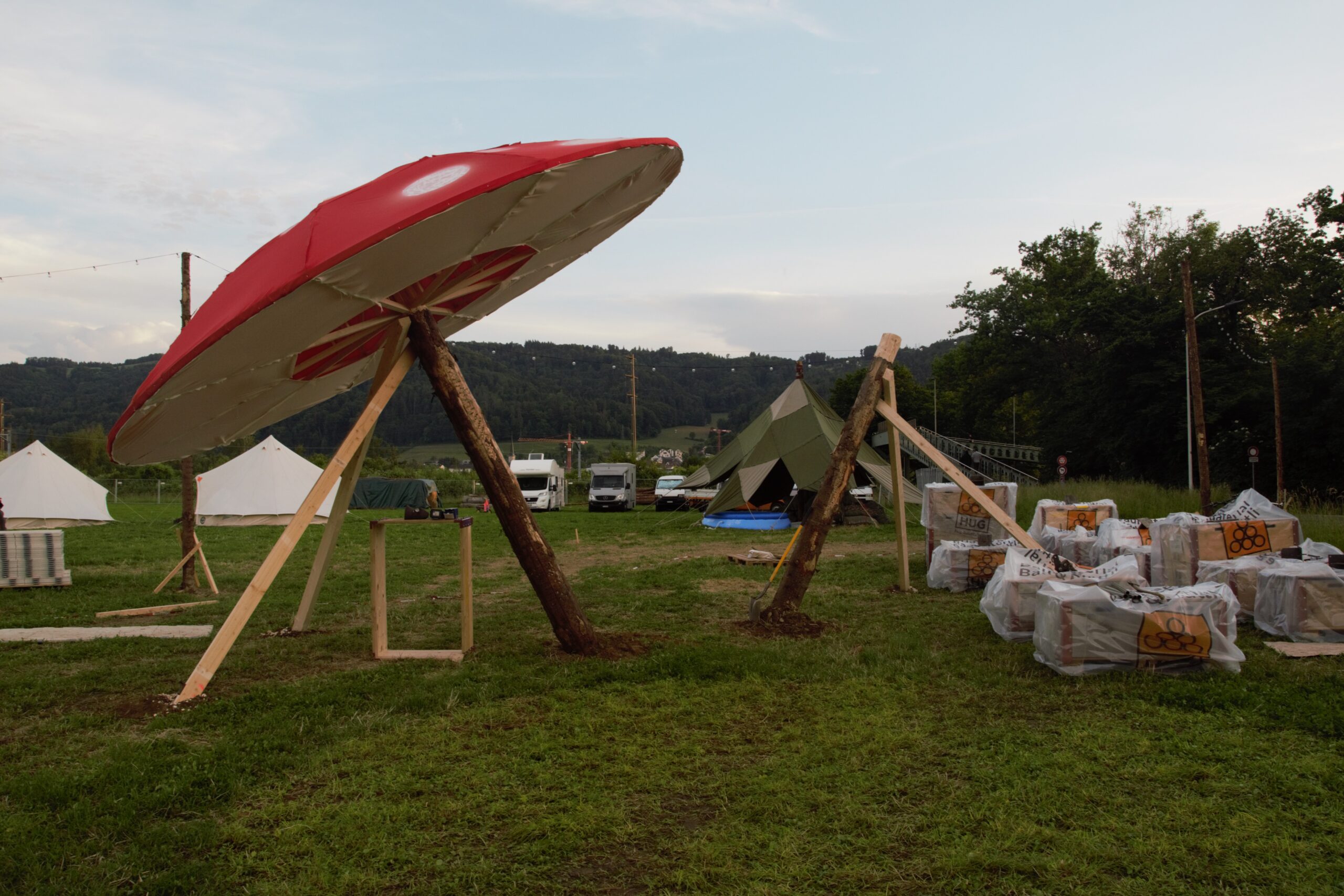 Das nationale Pfingstlager von Jungwacht Blauring, Jublasurium, ludt ein zur Insektenkonferenz. Menschen in Insektengrösse bedeutet Pilze in Übergrösse – entsprechend angetan waren wir von der Idee, zwei Mottopilze zu gestalten. Mit einem kleinen Team und inmitten von 5 weiteren Bauten von Outdoorsolutions machten wir uns ans Anfertigen und Bespannen von Kugelsegmenten.