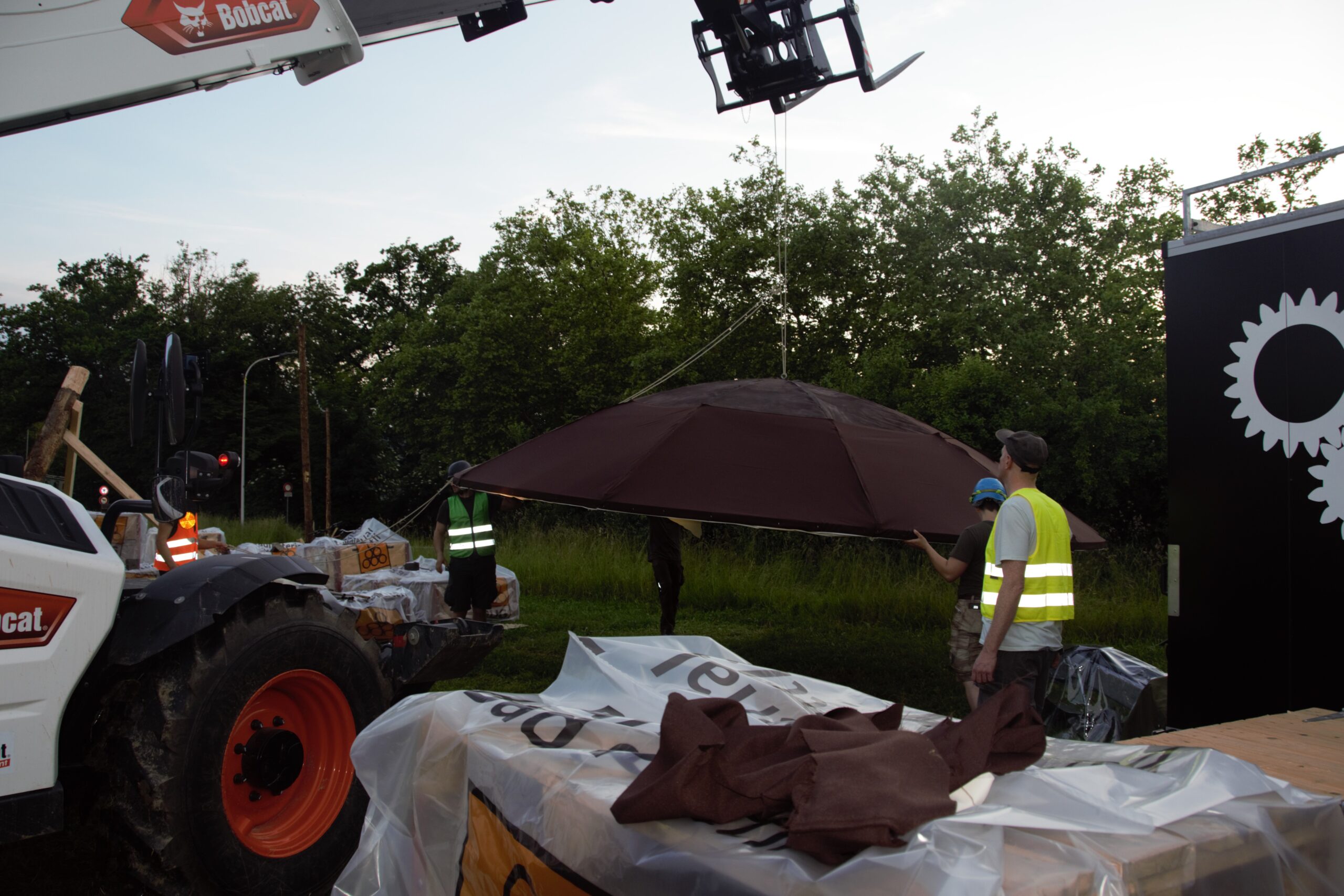 Wie fertigt man einen Pilzhut mit einem Durchmesser von 5m, der auf einer Höhe von 3m montiert werden soll? Die Lösung war in der Theorie ganz einfach: Man produziert ihn auf dem Boden und montiert ihn danach auf dem Stamm. Die Unterkonstruktion des Pilzhutes war ein Fachwerk, für die Rundung halbierten wir Dachlatten zu dünnen Latten, und bespannten den Hut mit Stoff. Um den Pilzhut heben zu können, montierten wir eine M12-Ringmutter am höchsten Punkt.